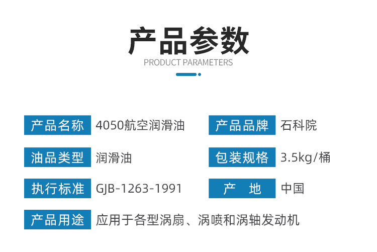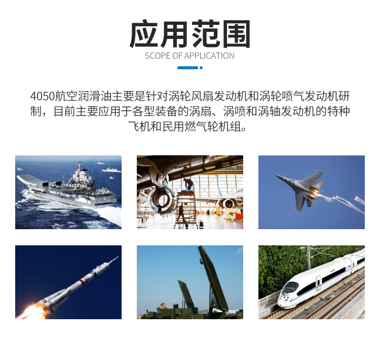 是石科院生產的、滿足國軍標GJB 1263-1991的國產高溫合成航空潤滑油。4050油的的組成是新戊基多元醇酯外加抗氧劑、抗腐蝕劑和抗泡劑等添加劑。其主要是針對渦輪風扇發動機和渦輪噴氣發動機研制,目前主要應用于各型裝備了渦扇、渦噴和渦軸發動機的軍用飛機和民用燃氣輪機組。