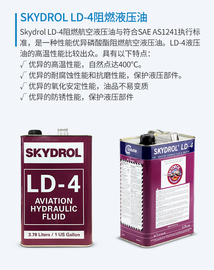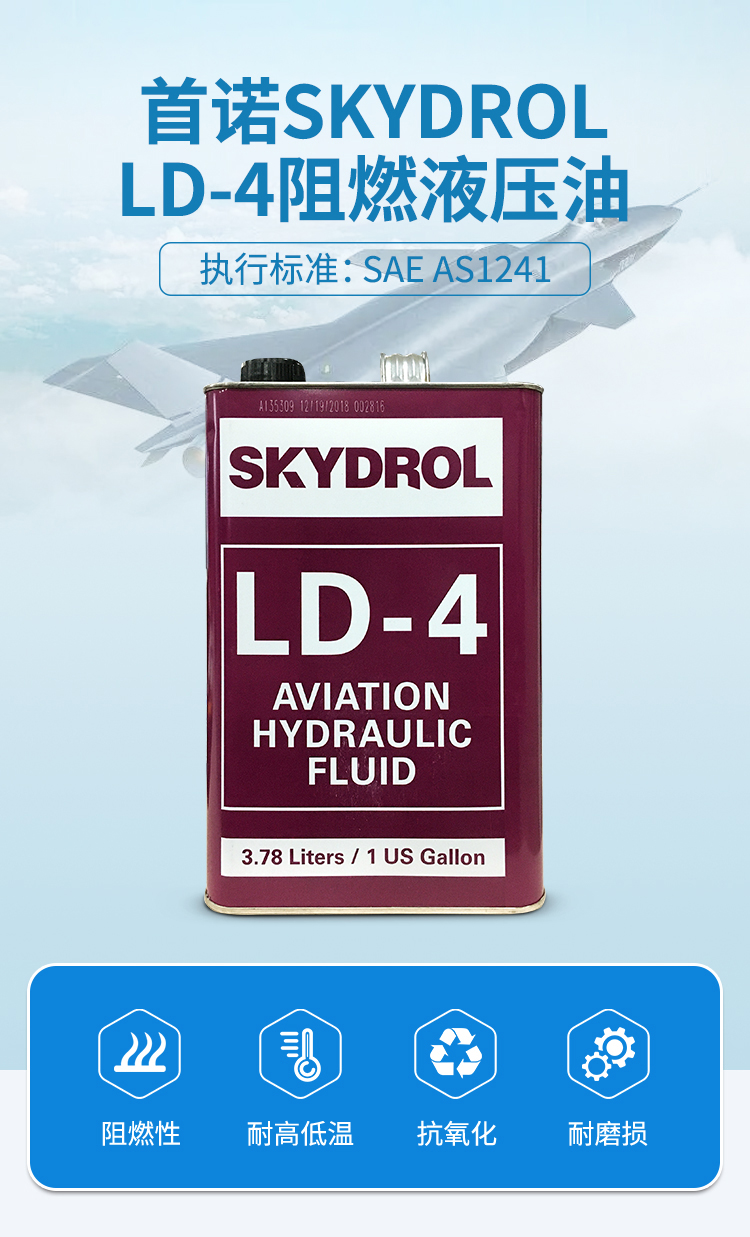 除了Skydrol LD-4之外,河南航材還能為您提供符合AS 1241 V類標準的Skydro 5、Skydrol PE-5型阻燃液壓油,歡迎致電選購!