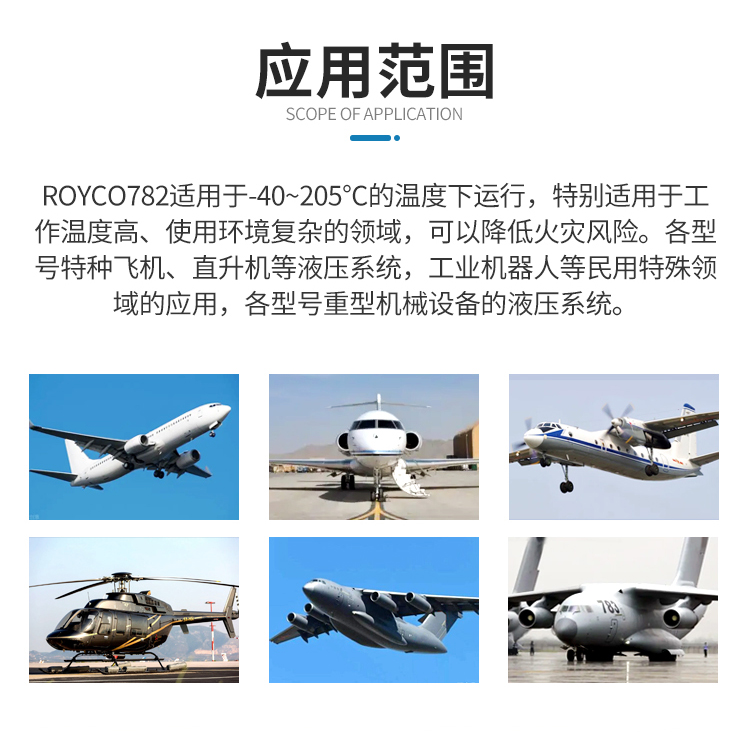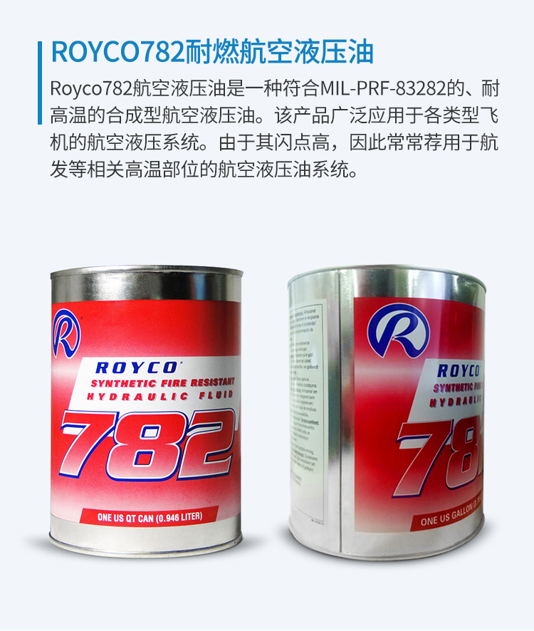 Royco782航空液壓油是一種符合MIL-PRF-83282的、耐高溫的合成型航空液壓油。該產品廣泛應用于各類型飛機的航空液壓系統。由于其閃點高,因此常常薦用于航發等相關高溫部位的航空液壓油系統。