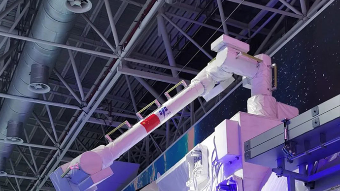 除了主要的艙體之外,我們在現場還可以看到包括太陽機翼、中繼天線、對接機構、大小機械臂、艙內實驗機柜等配套設備。這些外部設置中,空間站機械臂十分吸引我們的眼球。