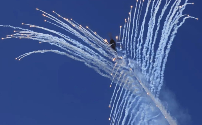 這是由4架直10組成的菱形隊伍,到達觀眾區后4架直10突然同時拉起、飛到頂點后打出漂亮的干擾彈,之后四架飛機朝四個不同的方向倒轉飛行,數秒內在天空中形成一個絢麗的“花朵”,完美地展現了四機開花的驚艷。