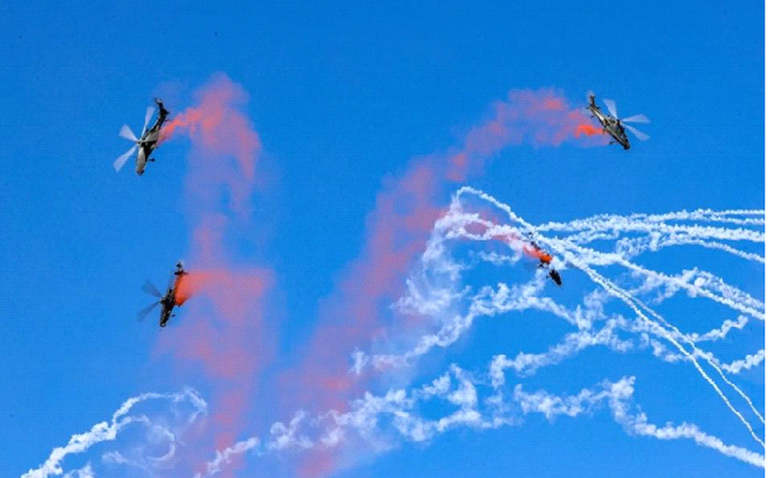 在現場觀眾的熱情呼喊下,陸軍“風雷”飛行表演隊驚艷亮相,風就是迅速,雷代表勇猛,聽名稱就知道這是一場令人震撼的表演!這場表演有驚艷的“四機開花”、期待已久的“直20獨秀”和震撼的“三機芭蕾”。